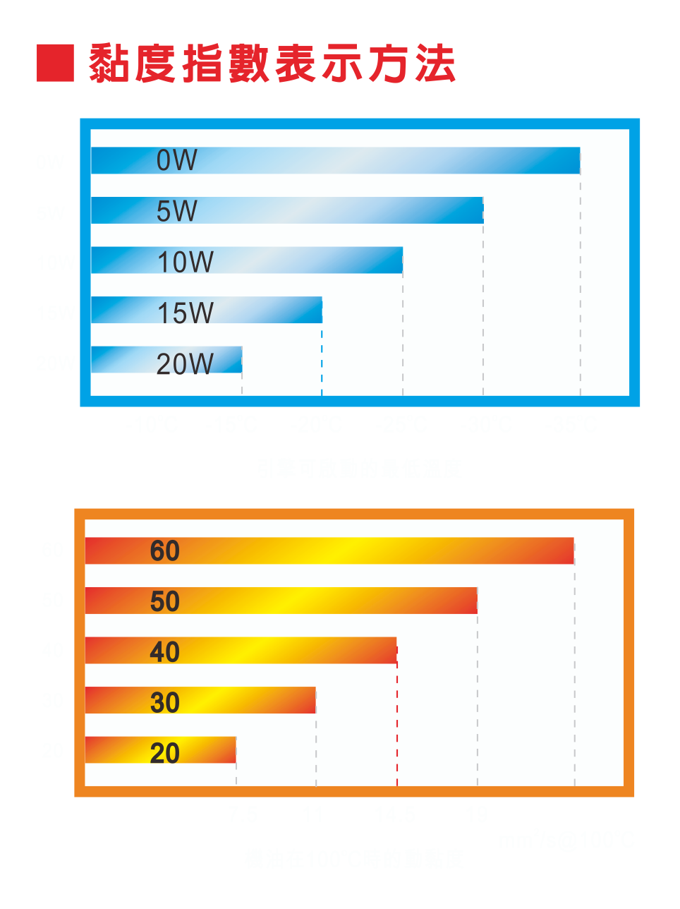 黏度指數越低者,表示溫度變化幅度大時,黏度變化較大;反之,黏度指數越高者,表示溫度變化幅度大時,黏度變化較小。