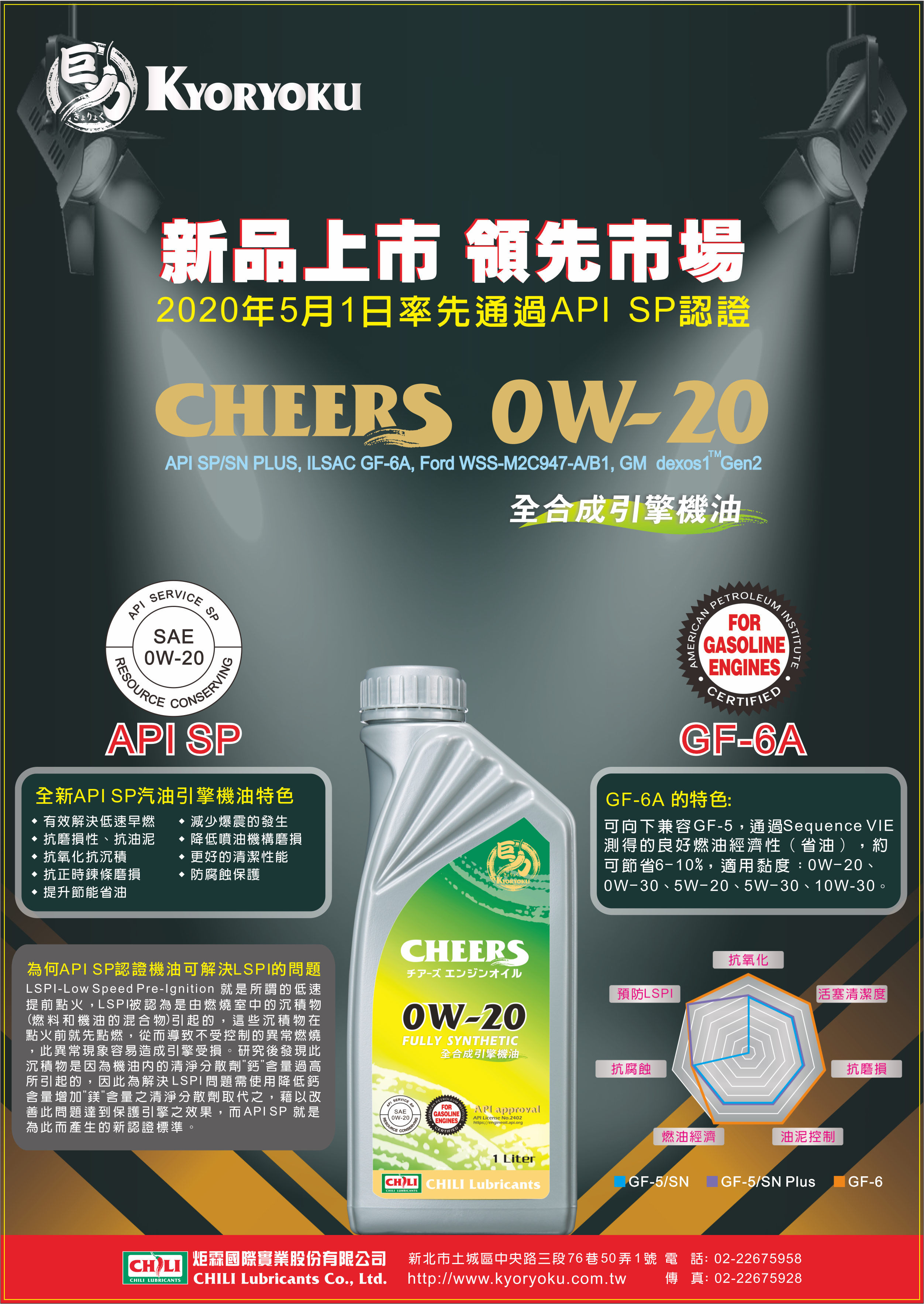 CHEERS 0W-20 全合成引擎機油,採用 100% 全合成基礎油精製而成,具有極佳的流動性與抗氧化性,2020年5月1日率先通過API SP 認證,有效解決低速早燃 ( LSPI ) 的問題,特別適合缸內直噴之汽油引擎,符合 ILSAC GF-6A 認證,能有效提高燃油經濟效率。 ► 產品規格: • API SP • ILSAC GF-6A • Ford WSS-M2C947-A / B1 • GM dexos 1™Gen2